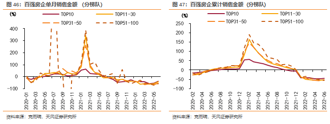 分梯队来看,Top10、Top11-30、Top31-50、Top51-100年内累计销售额分别同比-48.0%、-56.1%、-56.5%、-52.5%。百强房企中累计销售额降幅高于30%的房企超过八成,且各梯队中均有出险房企存在,反映出当前时点行业面临的整体性压力。分违约与非违约房企来看,21年非违约房企增速明显领先于违约房企,但2022年2月后,增速差优势出现弱化,说明影响居民购房选择的除行业信用风险外,其他系统性因素也对实际住房需求的修复形成掣肘,主要制约因素或包括:1)经济下行降低居民加杠杆意愿、削弱地产政策效果;2)疫情冲击下购买力因收入预期减弱,并且影响出行和带看预期;3)市场供求失衡引发的房价波动等因素。
