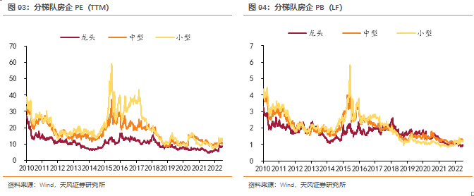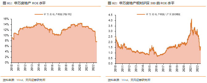 PE、PB估值分化意味着背后隐含ROE水平正处于较低区域,截至统计日,申万地产板块整体ROE(PB/PE)水平为7.7%,历史分位数为0.7%,相对沪深300指数的ROE分位数为61.3%。整体来看,当前PE分位数与历史上12年8月、14年6月较为接近。而PB及ROE指标均位于2010年以来的底部区间。我们认为PE修复反映政策预期改善,未来PB修复空间将取决于资产质量和盈利能力改善,随着行业风险释放、格局优化和拿地质量提升,PB有望回归合理水平。