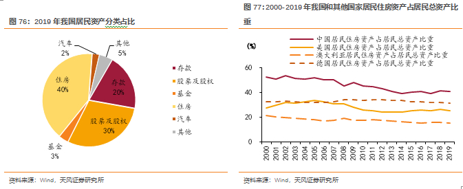 我国居民资产中,住房占比较高。2019年,我国居民房产占总资产比例达到40%,其他构成居民资产的主要资产分别为股票及股权(占比30%)、存款(20%)、证券投资基金份额基金(3%)、汽车(2%)。尽管我国居民房产占总资产比例在持续下降,2000年该比例为52%,2019年降至40%,但仍然高于美国(2019年该比例为25%)、澳大利亚(2019年该比例为15%)、德国(2019年该比例为31%)。