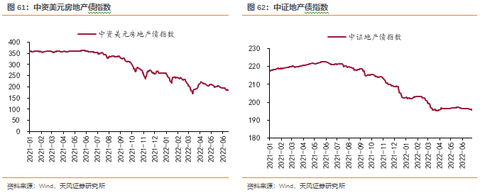 从地产债指数来看,2021下半年以来,地产行业景气度下行地产企业违约预期的不断攀升,致使中资美元房地产债指数和中证地产债指数持续暴跌,指数走势与境内房地产股估值相似,收益率受到基本面影响较大。