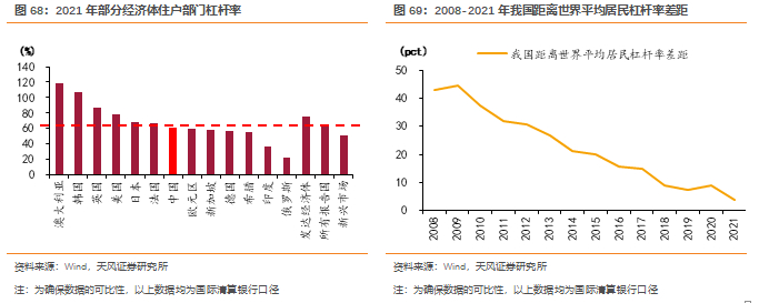我国居民杠杆率与世界平均水平的差距逐年缩小。根据国际清算银行,2008年末,我国居民杠杆率较世界平均低42.9pct;2021年末,该差距缩小至3.8pct。根据国际货币基金组织,居民杠杆率高于65%或影响到金融稳定。2021年末,我们距离该警戒线的差距缩小至3.4pct。