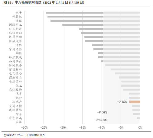截至2022年6月30日,申万地产板块年内绝对收益-2.83%,跑赢沪深300 指数6.75 个百分点,绝对收益位居申万一级行业第6,表现弱于交通运输、建筑装饰等板块,高于建筑材料、电气设备等行业。