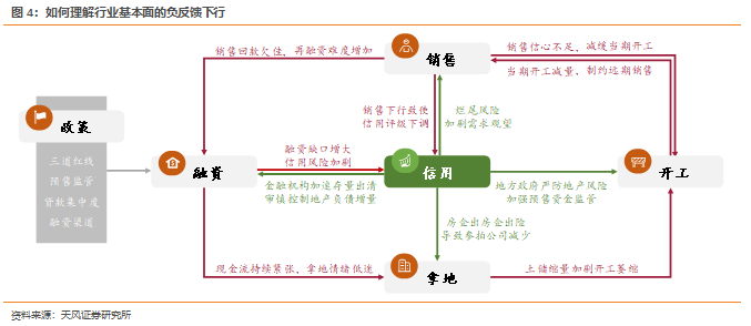 我们认为,本轮地产金融供给侧改革的初衷在于遏制泡沫化、金融化势头,引导行业平稳健康发展,在供给侧表现为制约房企无序扩张,规避大周期波动风险,在需求侧则表现为通过行政调控进行逆周期调节,进一步稳定短周期。但在执行过程中,监管机构、金融机构、房企、购房者、上下游参与者之间旧平衡被快速打破,新机制尚未建立之前,预期快速反转导致行业基本面、信用面出现负反馈式调整:长期供需结构变化,去杠杆暴露信用风险,债权人、监管资金、供应商加剧流动性挤兑,信用、交付风险和疫情冲击加剧需求观望情绪,销售下行进一步冲击行业现金流,并围绕产业链外溢至拿地、开工、施工等环节,逐渐偏离温和出清和健康调整的目标。