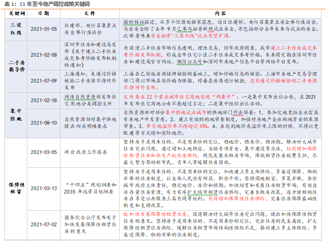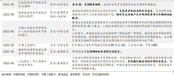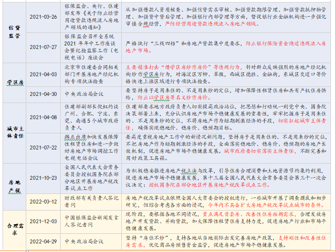 2021年至今,地产调控延续“房住不炒”定力,呈现“前紧后松”特征,并在22H1加速步入宽松。21Q1-Q3,政策整体偏好收紧,在需求侧,地方“四限”与信贷持续收紧,房地产税试点进一步引导市场预期向下;在供给侧,融资监管趋严加速房企缩表进程。21Q4以来,伴随行业基本面承压加剧、信用风险持续暴露,政策开始引导市场预期回归理性,并在22Q1以来加速调整。在需求侧,明确支持“因城施策”和“改善性住房需求”;在供给侧,政府积极引导“收并购”,鼓励行业市场化出清。