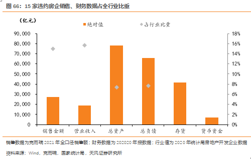 15家违约房企2021年全口径销售金额2.74万亿元,占全国商品房销售额比重约15.0%。由于部分违约房企未披露21年报,故选取2020年财务数据进行测算:20年违约房企营业收入1.86万亿元,占当年房地产开发企业经营总收入的15.7%;总资产7.80万亿元,占房地产开发企业资产总计的7.3%;总负债6.56万亿元,占房地产开发企业负债总计的7.7%。违约房企存货约4.2万亿元,货币资金0.7万亿,二者合计较总负债的资金缺口达1.7万亿。