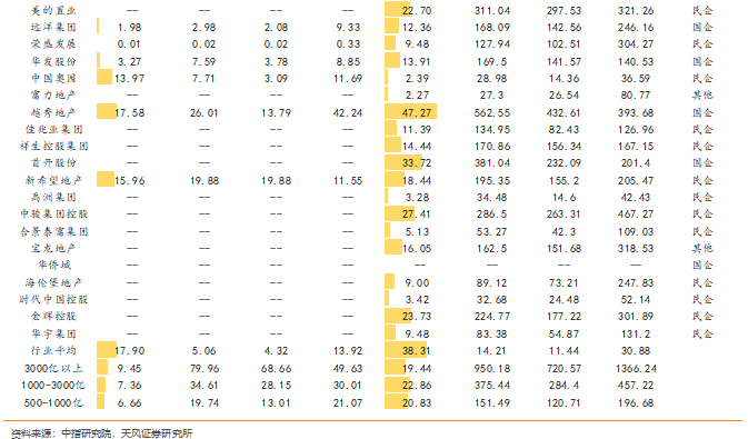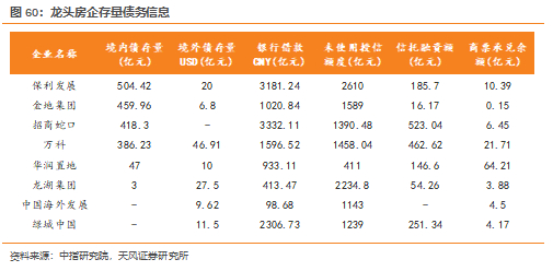 分梯队来看,销售规模3000亿以上的房企境内发债规模为503.8亿元,同比+16.2%;1000-3000亿阵营发债规模384.8亿元,同比-50.8%;500 -100亿的发债规模146.8亿元,同比-42.2%。分企业看,龙头房企中“招保万金”境内债存量规模领先,龙湖仍有较充足的未使用银行授信,头部房企及优质民企存量优势凸显。