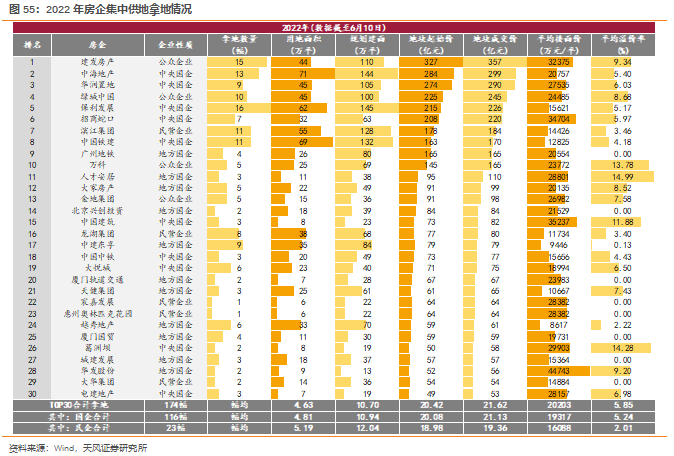 从集中土拍视角来看,尽管22年上半年集中供地各地围绕土拍门槛、优质地供应等方面均出现政策利好,但市场整体表现依旧偏冷,企业间因销售及资金状况差异成交热度分化特征明显,国央企继续担任拿地主力,民企参与度持续走低,地方平台则更多扮演托底角色。截至2022年6月10日,集中供地拿地金额TOP30中,国央企成交价款占比达到65%,Top30中仅滨江、龙湖等五家民企,拿地金额占比仅12%,平均溢价率低于国央企。国企紧抓拿地机遇期积极补仓,在改善利润率的同时未来销售预期得以稳定,估值存在进一步修复空间。