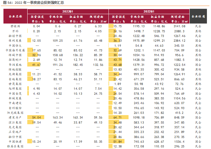 从投资强度来看,中指数据显示,22年一季度行业的平均投资强度为17.9%,较2021全年的38.3%下降明显。其中,21年销售规模3000亿以上的房企一季度平均投资强度为9.45%,较2021全年投资强度下降10.0%;1000-3000亿的平投资强度为7.4%,较21年下降15.5%;500-1000亿的平均投资强度为6.7%,较21年下降14.2%。房企拿地强度下降明显,而头部房企强度降幅相对较窄反映其在资金优势下的投资韧性。