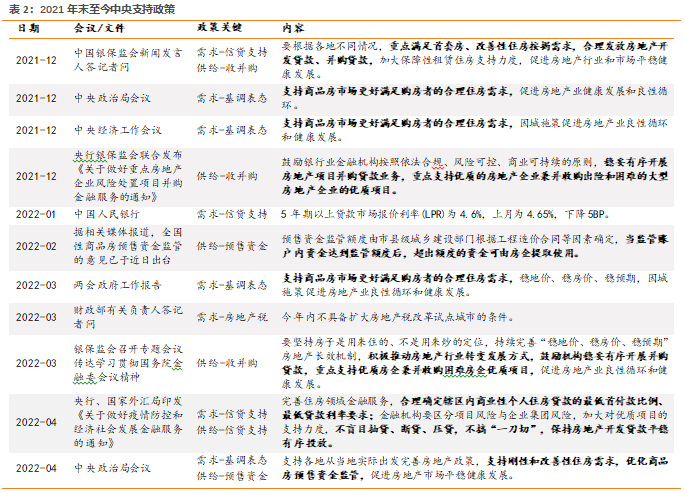 21Q4以来,政策供需发力,多措并举引导行业回归平稳健康发展区间。虽然并未出台强刺激或大力度纾困政策,但是政策形成合力有效推动行业预期自然修复。