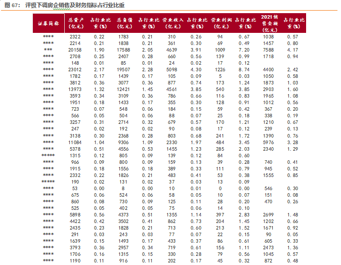 67家评级下调的民企21年总销售金额占全国商品房销售额比重约35.0%;20年总资产占开发企业资产总额的15.9%;总负债占开发企业负债总额的16.1%;营业收入占总经营收入的30.9%。整体来看,财务安全性相对偏低的民企由于过往杠杆率高、周转快,对行业整体的销售和盈利能力冲击相较资产端更大,在下行周期业绩波动性高。考虑当前时点销售的复苏预期、政策托底下融资环境的改善预期以及收并购推动市场化出清,我们认为行业有望实现平稳着陆。