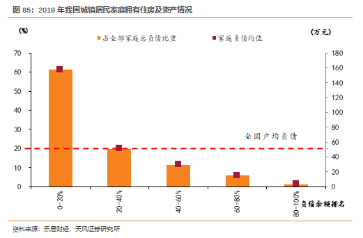 2)杠杆的不均衡:2019年我国城镇居民有负债的家庭中,户均家庭总负债为51.2万元,其中负债最高20%家庭的户均负债157.3万元,承担被调查的全部家庭总负债的61.4%;负债最高40%家庭承担全部家庭负债的81.3%。
