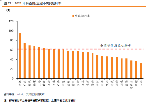 根据我们的测算,我国各个省份的居民杠杆率差异较大。居民杠杆率超过全国整体水平的有浙江、广东、重庆、福建、上海、甘肃等六个地区;山西、新疆、内蒙古的居民杠杆率不足40%。我们认为全国整体的杠杆率提升空间有限,但各区域杠杆差异明显。