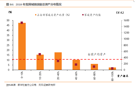 1)财富的集中性:2019年我国城镇居民家庭中,资产排名前10%家庭的资产在全部家庭总资产的比重达到47.5%,资产前40%的家庭的资产占全部家庭总资产的80.8%。全国城镇居民家庭总资产均值为317.0万元,资产前10%的家庭资产均值为1511.5万元远超过整体均值,表现了我国家庭资产的高集中度。