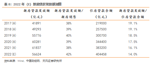 根据新房贷款发放额和住房贷款余额的比值逐年降低的趋势,我们根据近年来该比值下降幅度,假设2022年新房贷款发放额/住房贷款余额的比值较2021年的下降幅度略有增长(2021年下降幅度为1.4pct,2020年为1.0pct),我们假设2022年该比值取14.0%;根据央行提到的新房个人贷款发放额和新建商品住宅销售额的比值长期在(38%,42%)区间,考虑到今年各地方对于限贷政策逐渐放松,我们假设2022年新房个人贷款发放额和新建商品住宅销售额的比值为42%,因此测算2022年新房贷款发放额约为5.7万亿元。