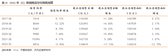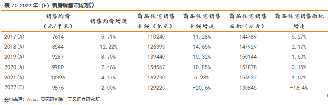 在同样假设销售均价下降5%的基础上,我们测算得出2022年商品住宅销售金额为13.5万亿,同比下降17.15%;商品住宅销售面积13.7亿方,同比下降12.8%。