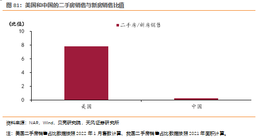 2)住房项:住房依然是我国居民资产占比最高的资产类别,表明我国存量房市场空间较大。然而我国目前房产交易依然以新房销售为主,二手房交易仅占房产总交易的30%左右。在美国等发达国家,房产交易以二手房为主。以2022年1月为例,美国的年化二手房销售套数为649万套,相应的新房销售套数83.1万套,二手房销售与新房销售比值(按套数)接近7.9。而2021年我国二手房销售与新房销售比值(按面积算)约0.2,二者相差悬殊。我国的二手房市场发展空间大,若可通过二手房置换新房,一方面盘活居民存量资产,另一方面在稳定杠杆的基础上撬动新房市场销售。