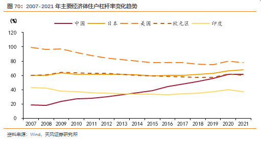 2008年金融危机以来,我国居民杠杆率上升较快,美国、欧元区等经济体经历了降杠杆。2007年,我国居民杠杆率为18.9%,2021年已达到61.6%,仅2008年、2021年两年的居民杠杆率略微下降,其余年份均较上年提升。近五年的居民杠杆率提升迅速,2017年我国居民杠杆率为48.1%,2020年以达到61.8%。相较于我国的杠杆率攀升,2008年金融危机后,美国、欧元区经历了去杠杆,分别由2008年的96.3%、60.7%下降至2019年的75.3%、57.3%;日本和印度的居民杠杆率水平相对稳定,2018年以前分别维持在61%、35%左右,2019年以来居民杠杆率有小幅提升。