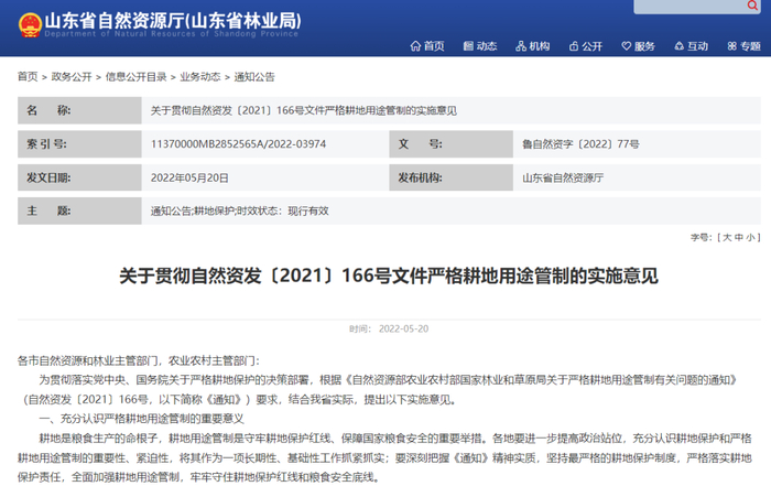 5月20日,山东省自然资源厅和山东省农业农村厅联合发布了《关于贯彻自然资发〔2021〕166号文件严格耕地用途管制的实施意见》的通知(下称通知),要求落实《自然资源部农业农村部国家林业和草原局关于严格耕地用途管制有关问题的通知》精神,全面加强耕地保护和用途管制。