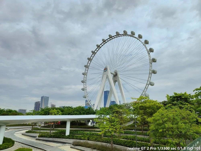 话不多说,我们直接进片。在白天自然光场景下,我们可以看到高通队伍的 IMX766 有很不错的表现,就算是在阴天场景下,色彩的表现也是很突出的,特别是画面底部的树木依然是葱葱郁郁的样子。当然这个画面其实已经比肉眼看起来更加明亮和鲜艳,这个跟真我本身的成像风格更有关系。