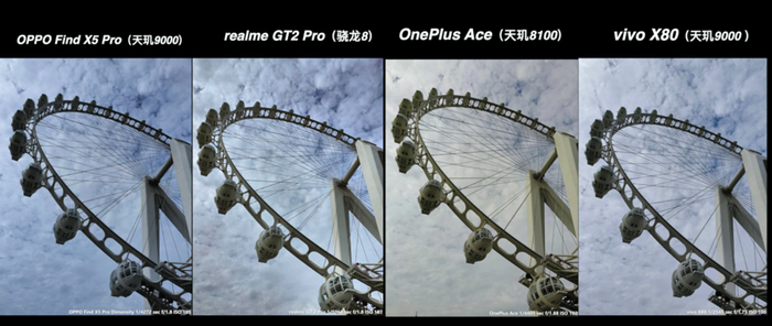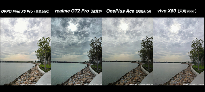 这个场景下,一加 Ace 的表现反而与真我 GT2 Pro 高度一致,同样也是保云层细节和稍低的曝光。而 X80 由于有独立影像芯片,色彩、曝光和宽容度都更好,当然也是胜之不武,我们只用来当作参考即可。