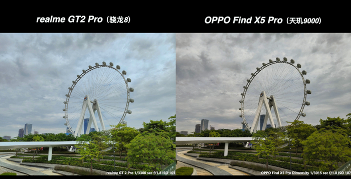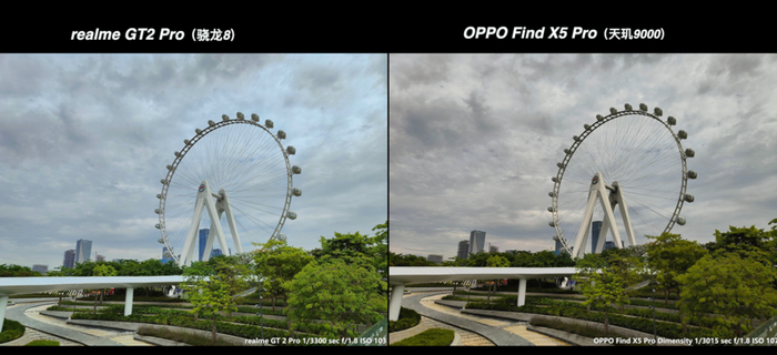 而在另外一个大背光的场景下面,OPPO Find X5 Pro 还是优先识别成蓝天,色温就变得非常的冷,没有开启 HDR,真我 GT2 Pro 在这一张里面色温反而有点偏暖了。