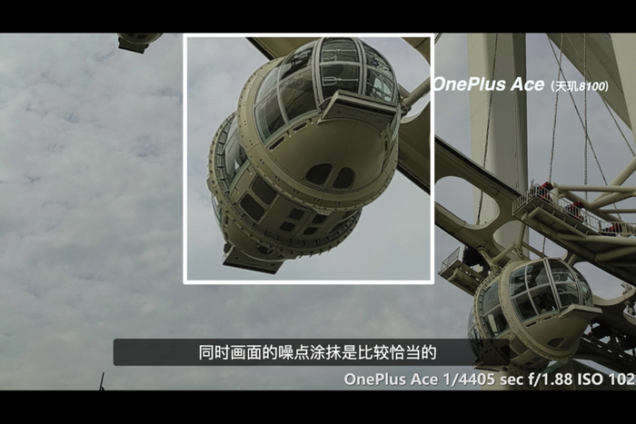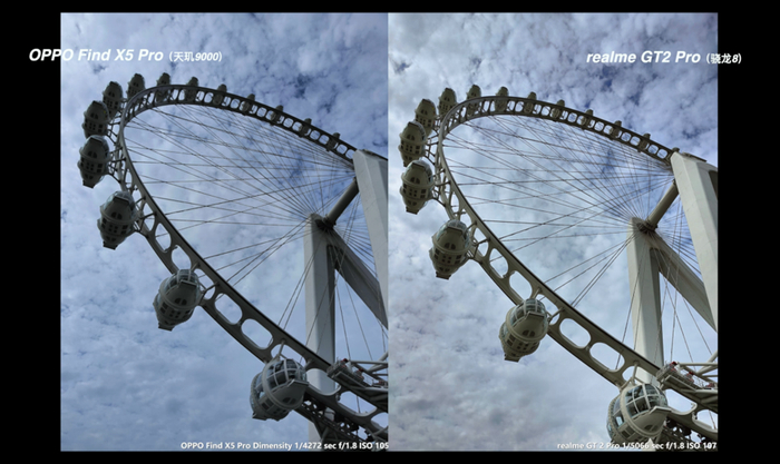 两者的解析力表现都不差,不过 Find X5 Pro 除了有之前说的边缘细节锐化更重手一点的情况外,对噪点的涂抹也是比较明显的,看上去物体的表面会平滑很多。适当的涂抹当然能有效降低噪点对画面的干扰,不过太用力的话也会影响到细节的呈现。比如说这张里面摩天轮座舱表面的螺孔细节,Find X5 Pro 就会相对虚一些。