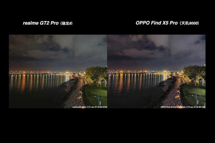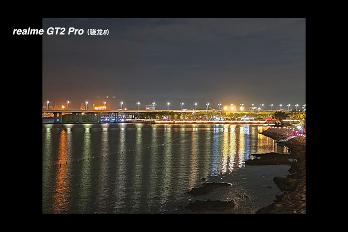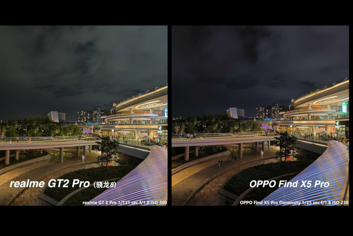 在更深的夜里,真我 GT2 Pro 和 OPPO Find X5 Pro 的表现也如上一个场景的表现,Find X5 Pro 可以依靠更暴力的夜景算法,使用更快的快门速度和更低的 ISO 同时让画面比 GT2 Pro 的画面更亮一些。