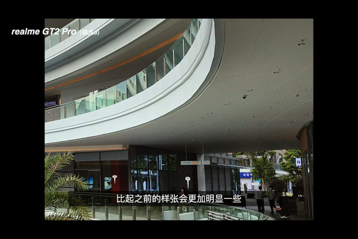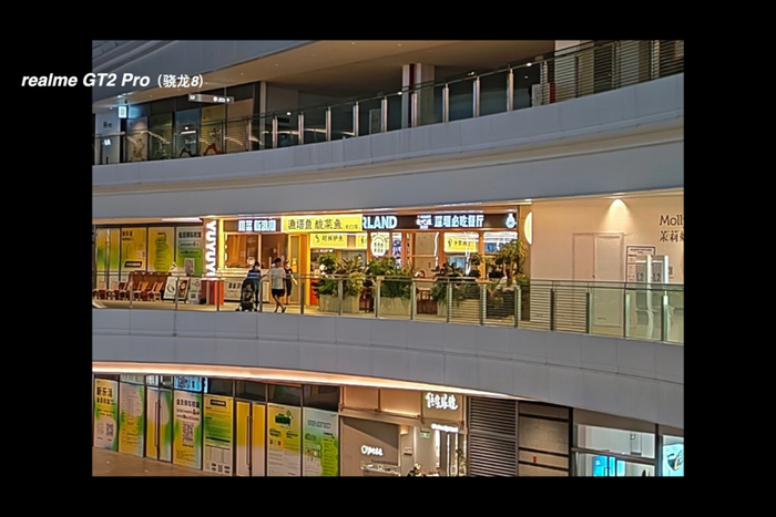 终于来到了夜景部分,在商场灯光的环境中,真我 GT2 Pro 的曝光很准确,同时也触发了夜景模式,商场里面的招牌灯光都有很好的压制重绘,放大观看也可以看清楚招牌灯光里面的文字内容。不过需要注意的是,这时候快门速度已经来到了 1/20 秒,虽然 GT2 Pro 也有 OIS,但还是要留意手持的稳定性。