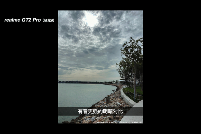 当然搭载高通骁龙 8 的真我 GT2 Pro 也并不是所有场景都能有好表现,例如这张海边的大光比场景,真我 GT2 Pro 的 AI 相机选择了优先呈现更明亮的天空云层细节,导致画面中间的草木和下方的石头有一点点欠曝。不过稍微暗一点的海面与太阳光线的照射有着更强的明暗对比,波光粼粼的感觉会更强烈一些,其实也是挺好看的。