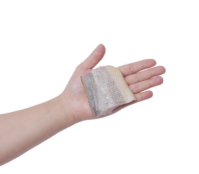 (和手掌一样大的一块生鱼肉,或单手的一捧虾,可食用部位大约是50克。来源:自己拍的)