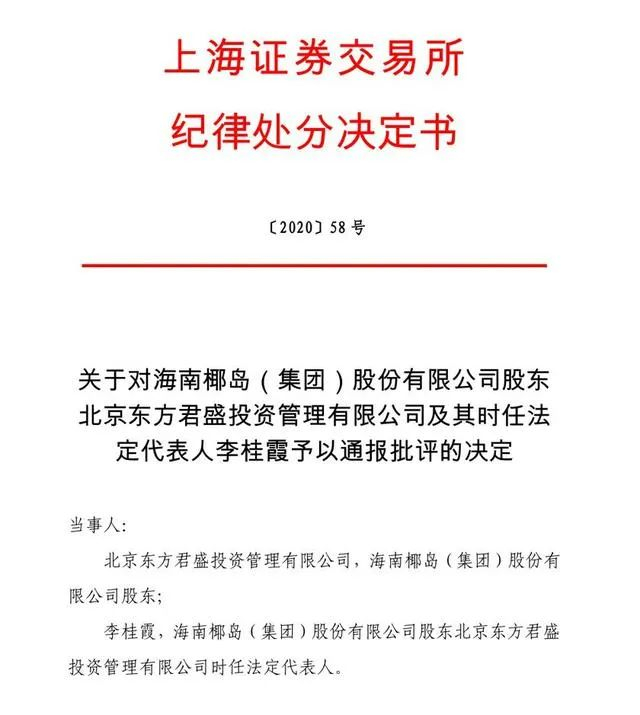 2020年6月,因此前增持存在违规事实,上交所对ST椰岛控股股东东方君盛及时任法定代表人李桂霞做出批评。
