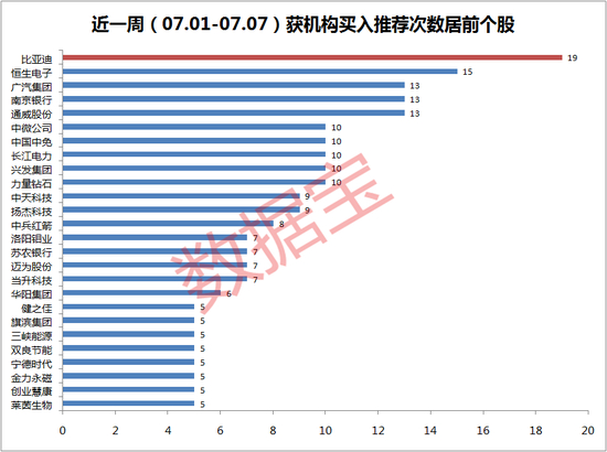 数据宝统计,共计62股获3次及以上机构评级。其中,比亚迪以19次评级居于首位。恒生电子、通威股份、南京银行等个股评级数量居前。