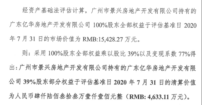 与此同时,景兴地产持有的广东亿华房地产开发有限公司39%股权,也在此次破产资产中,起拍价为人民币6017.03万元,增价幅度为50万元及其整数倍。