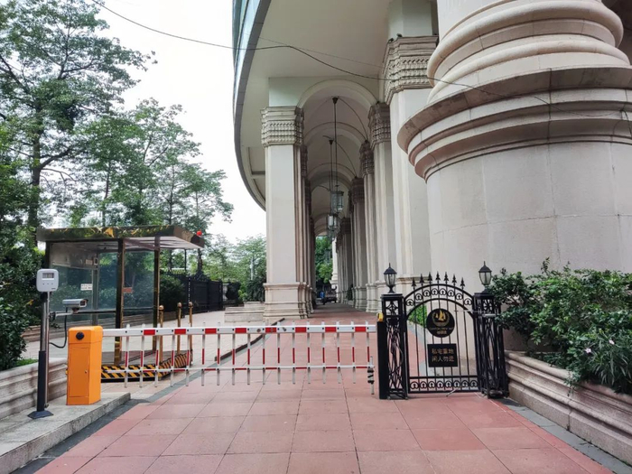 大楼出入口挂有“私宅重地,闲人免进”的提示牌。