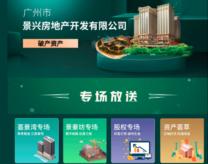 7月5日,京东拍卖平台显示,广州市景兴房地产开发有限公司的破产资产上架,包括江景豪宅爱群荟景湾部分房源、在建工程景豪坊东区、股权、名下知识产权等,将于7月26日-27日(延时的除外)进行拍卖。
