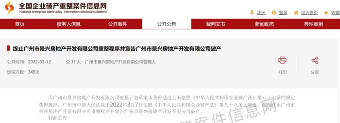 2022年3月,因广州市景兴房地产开发有限公司重整计划草案未获得通过且未依照《中华人民共和国企业破产法》第八十七条的规定获得批准,广州市中级人民法院裁定终止广州市景兴房地产开发有限公司重整程序并宣告广州市景兴房地产开发有限公司破产。