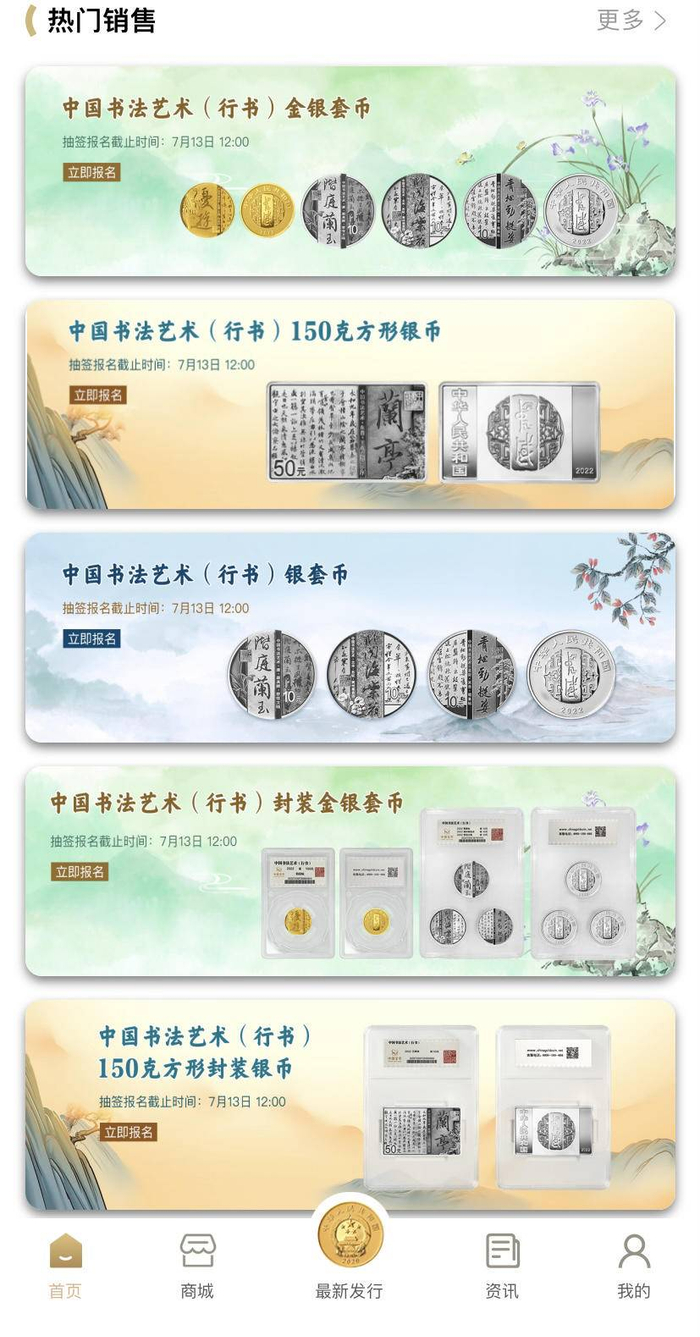 背面图案为《兰亭序》的150克长方形银质纪念币人气最高,它的价格为3000元,目前的金币云商APP上,已有超16000人报名抽签。这枚长方形纪念币含纯银150克,规格80毫米×50毫米,面额50元,最大发行量5000枚。