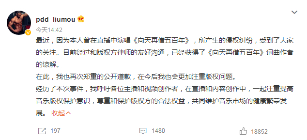 最近,因为本人曾在直播中演唱《向天再借五百年》,所产生的侵权纠纷,受到了大家的关注。目前经过和版权方律师的友好沟通,已经获得了《向天再借五百年》词曲作者的谅解。