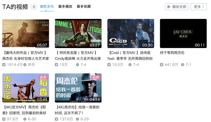 不过,围绕“周杰伦”的热度能带来多少长期价值,仍要打个问号。此次入驻B站的账号为杰威尔音乐官方账号,发布内容多为MV等,不同视频播放量悬殊,除了《最伟大的作品》,其他歌手的稿件播放量不足20万。