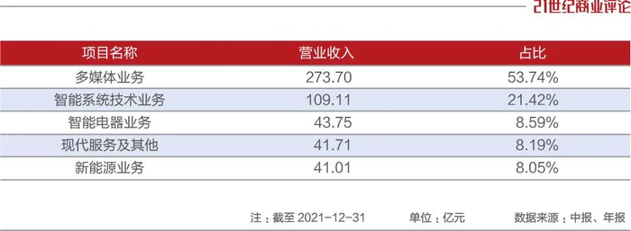 2021年,创维集团的营收大头仍是以智能电视为主的多媒体业务,全年营收273.7亿元,占比达到53.7%。