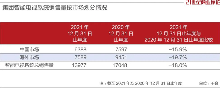 2021年,创维集团智能电视总销售量为1398万台,较上一年下降18%,国内市场和海外市场均有下滑。