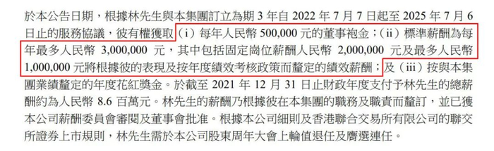 今年38岁的林劲,升任董事长后,每年固定工资为200万元,绩效薪酬为100万元,董事袍金为50万元。