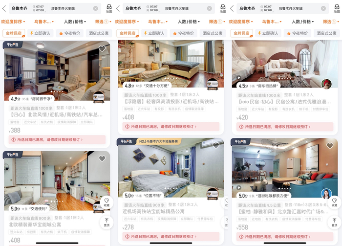 7月7日,澎湃新闻搜索发现,以7月7日入住、7月8日退房为例,当日乌鲁木齐火车站附近多个民宿都已满房。