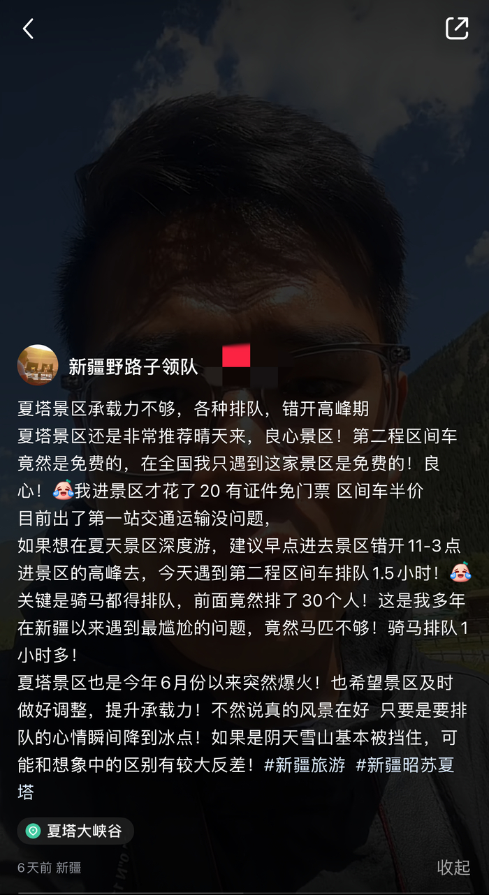 还有旅游博主在社交平台发布视频称“夏塔景区承载力不够,各种排队”。该博主在发布的视频介绍中指出:“今天遇到第二程区间车排队1.5小时!关键是骑马都得排队……这是我多年在新疆以来遇到最尴尬的问题,竟然马匹不够!骑马排队1小时多!”