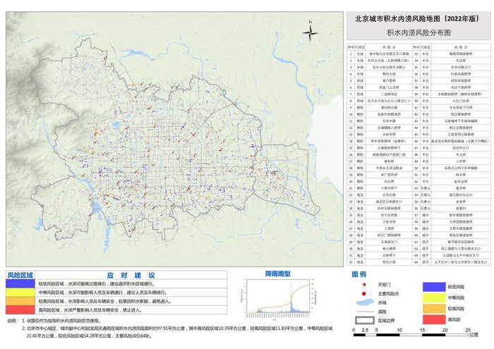 北京日报(IDBeijing_Daily记者注意到,积水内涝风险分布图,范围覆盖北京市中心城区、城市副中心和回龙观天通苑区域等重点区域,包括64处主要风险点位。