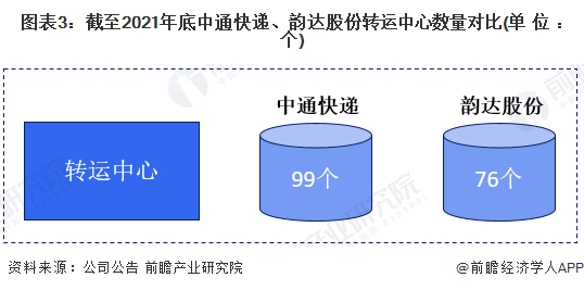 从转运中心数量来看,中通快递转运中心数量更多。根据两家公司年报数据显示,截至2021年底,中通快递转运中心数量达到99个;韵达快递转运中心数量达到76个。