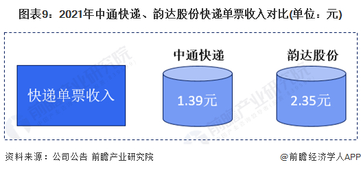 从快递单票收入来看,2021年,韵达股份的快递单票收入高于中通快递。2021年,韵达股份的快递单票收入为2.35元;中通快递单票收入仅为1.39元,中通快递在“价格战”中更具优势。