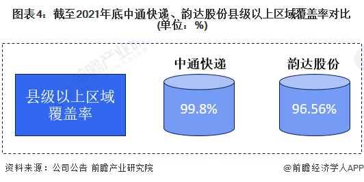从县级以上区域覆盖率来看,中通快递更胜一筹。根据两家公司年报数据显示,截至2021年底,中通快递县级以上区域覆盖率达到99.8%;韵达股份县级以上区域覆盖率为96.56%。