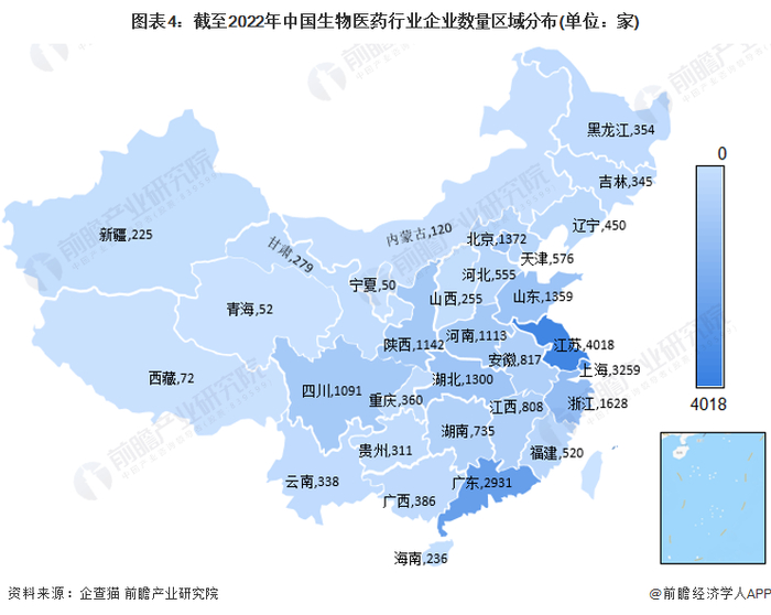 根据中国企业数据库企查猫,目前中国生物医药行业企业主要分布在长三角和珠三角地区,特别以江苏、上海和广东为代表。截至2022年6月底,江苏共有生物医药企业4018家,上海共有3259家、广东共有2931家。