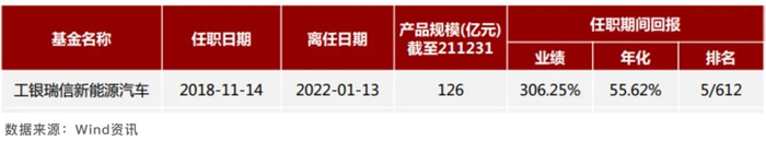 资料显示,闫思倩曾经管理过工银瑞信新能源汽车混合。据Wind统计,在2018年11月至2022年1月任职期间,该基金累计收益率306.25%,实现了三年翻3倍,年化回报高达55.62%,在同类可比的612只基金中排名第5,并且跑赢同期基准指数+123.69%,超额收益十分显著。